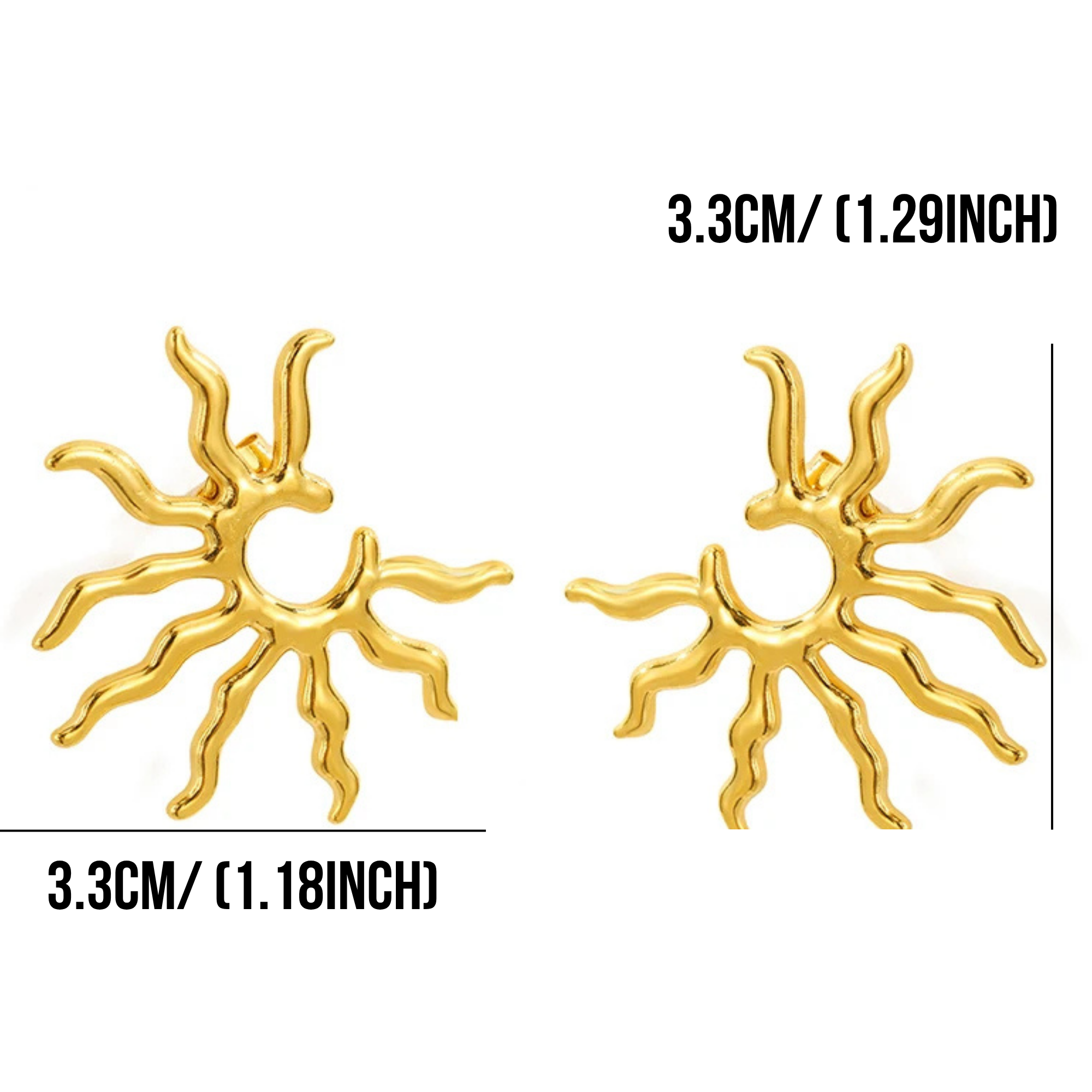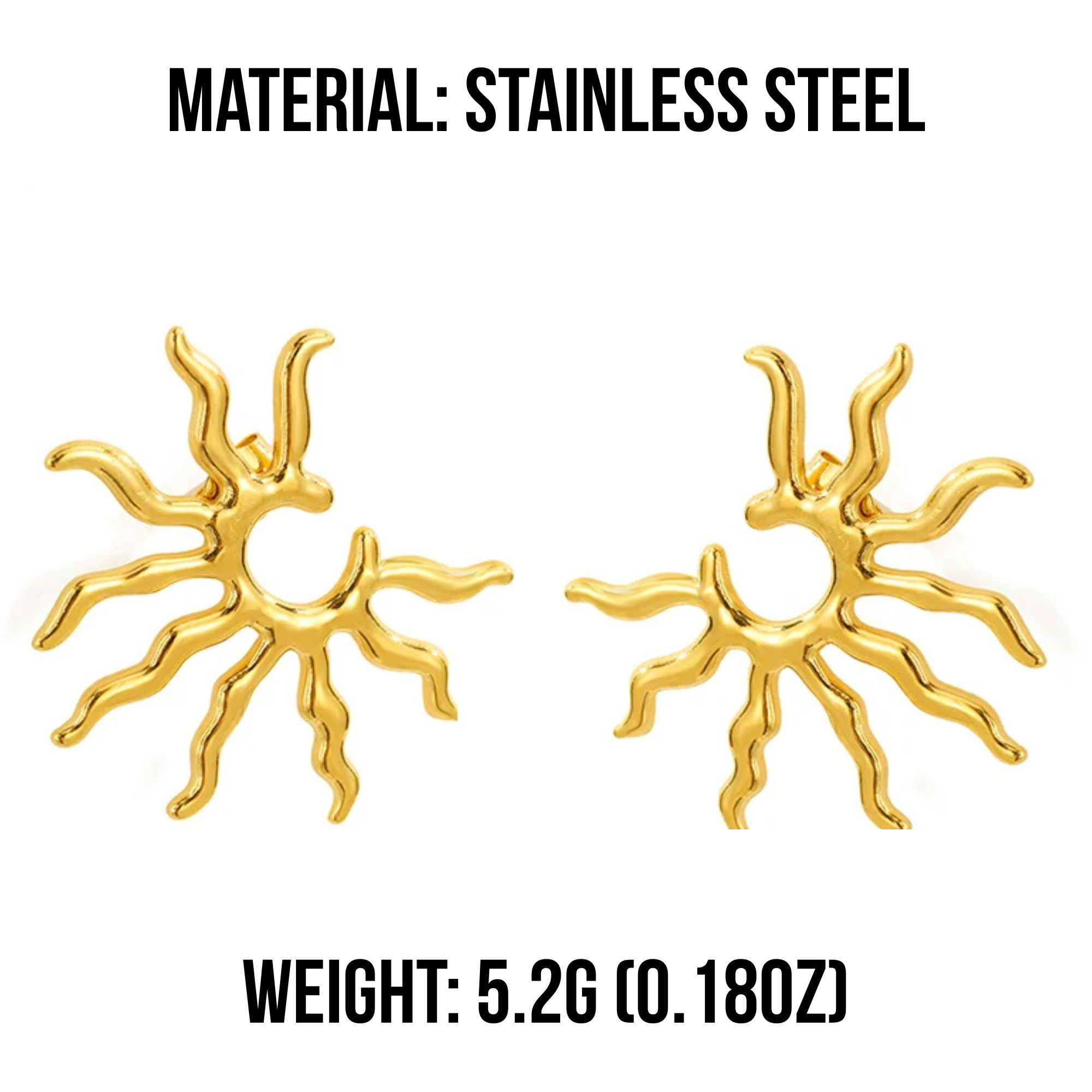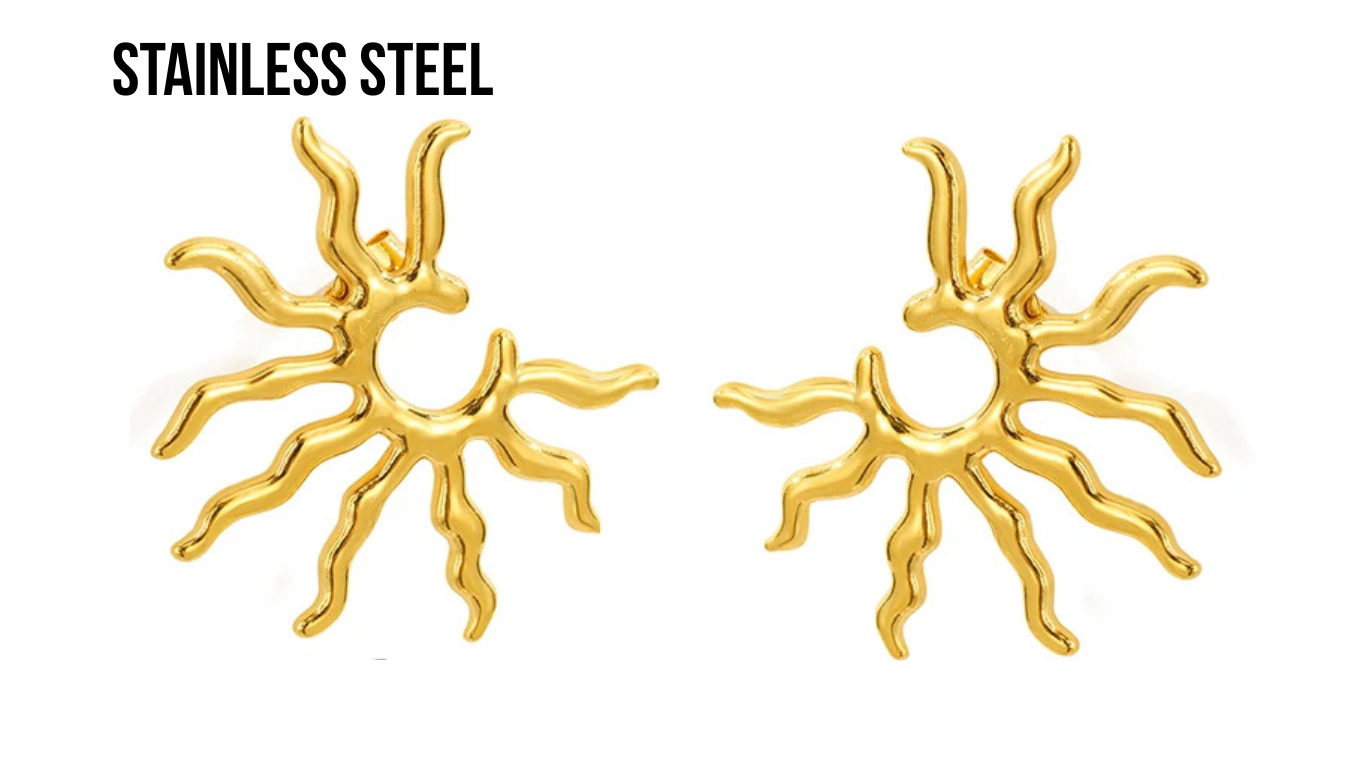 Brighten your look with these bold sun-inspired stainless steel stud earrings. Lightweight, hypoallergenic, and resistant to tarnish, they bring a radiant touch to any outfit. Perfect for adding a little sunshine to your everyday style.