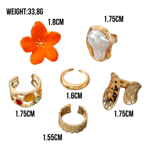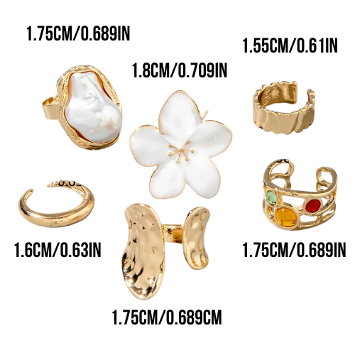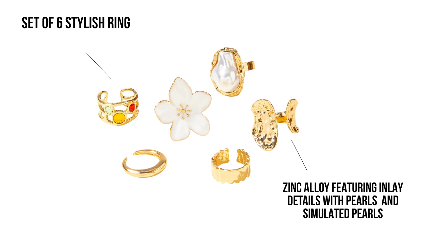 Set of 6 stylish rings crafted from durable zinc alloy, featuring elegant inlay details with pearls and simulated pearls. Perfect for stacking or wearing individually, these rings add a chic and versatile touch to both casual and dressy looks